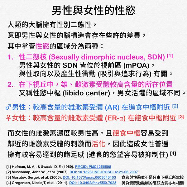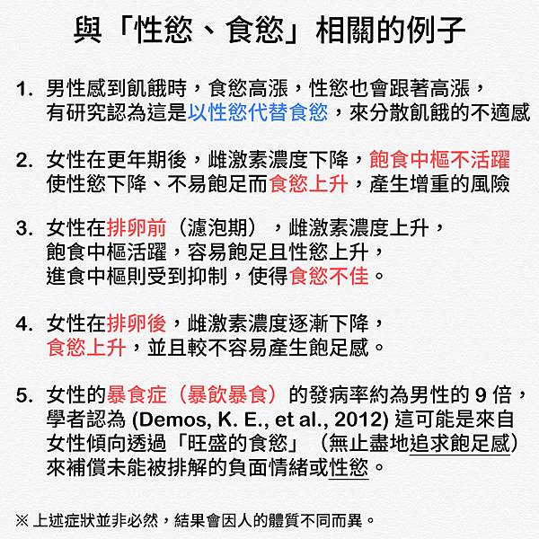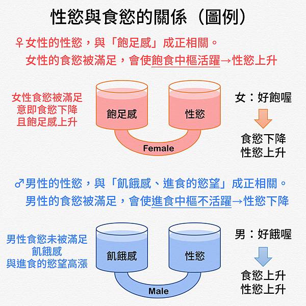 Richard CW Hall (1989) 等人對厭食症患者進行「性慾」的研究,發現患者普遍是性慾低下的,經治療後的患者對於性生活方面仍存在許多困難,甚至是感到厭惡與恐懼。連結到此篇貼文內容,厭食症患者的性慾普遍低下,但這與「正常女性在獲得飽足感之後的食慾低下」無關,患者基本上已無法感到正確的飽足感為何物,再加上多種負面情緒的影響,自然會使各種心情低落、性慾無法高漲。