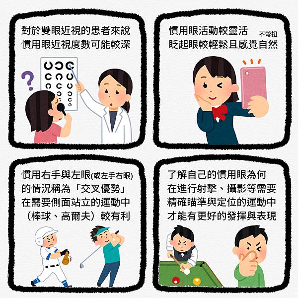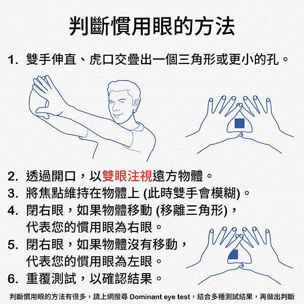 當然不是說慣用眼那隻眼的近視度數“一定”比較深,或是那隻眼眨眼時“一定”比較輕鬆,人各有異,亦會與個人一直以來的習慣有所關聯,此篇只是提供這個說法,讓大家先初步認識自己的慣用眼😉