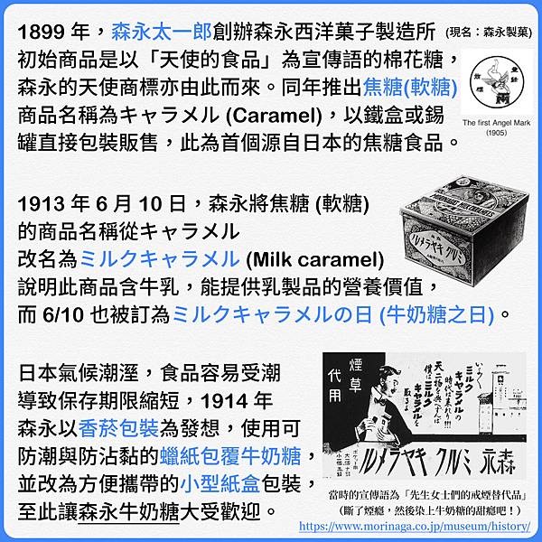 牛奶糖(以下皆指具有焦糖色的牛奶軟糖)與 #agad582 的煉乳相似,利用加熱方式降低乳製品中的水分,減緩細菌孳生,延長其保存期限。森永牛奶糖是第一個「源自日本」的焦糖食品,而非第一個出現的焦糖食品。在室町時代末期,葡萄牙傳教士傳入名為 caramello 的甜食(同期還有金平糖、長崎カステラ),日文稱為 カルメラ 或 #カルメ焼き ,將糖與蛋白或小蘇打粉混合加熱至焦糖化,此時小蘇打粉 (NaHCO3) 會受熱分解產生水蒸氣與二氧化碳,使糖體明顯膨脹,之後冷卻、硬化,並切塊食用,這就是我們台灣人也熟悉的味道👉 #椪糖