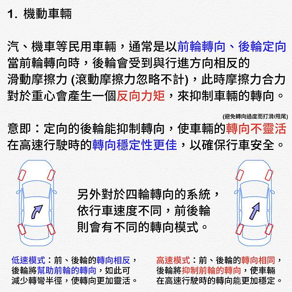 1⃣️前輪轉向、後輪定向👉轉向較不容易