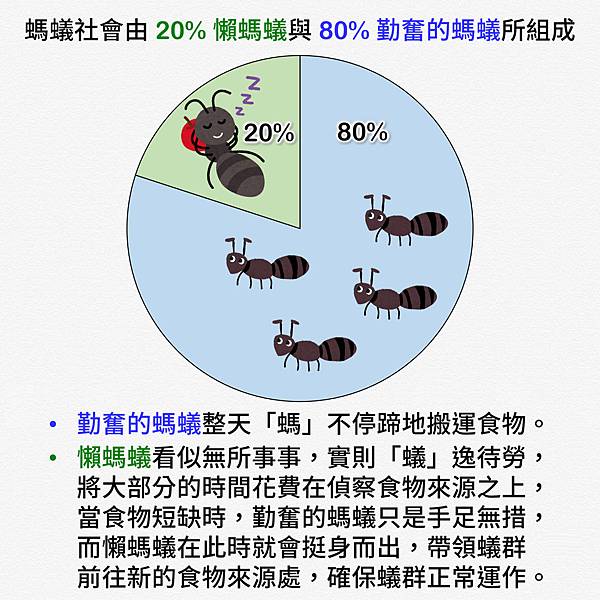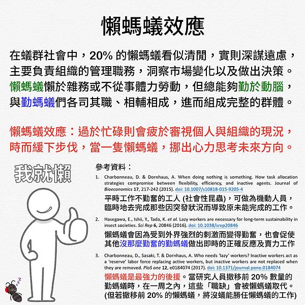 我們自小從兒歌中學到蜜蜂🐝、螞蟻🐜等昆蟲皆是勤勞的象徵,但研究顯示並非所有螞蟻都是一直在勤奮工作著,第一篇參考文獻的作者在同年2015年發表的文章(doi: 10.1007/s00265-015-1958-1)中統計出約有3%的螞蟻總是在勤奮工作、72%的螞蟻在至少一半的時間以上是無所事事的、25%的螞蟻則是永遠在懶惰,或是很賣力地在旁邊打轉、裝忙、發呆。無論懶螞蟻的確切比例佔有多少,懶螞蟻確實都是群體中重要的存在,好比公司的研發部分或管理階層,沒有「懶螞蟻」的領導,佔多數的勤螞蟻則會東忙西忙而沒有方向。