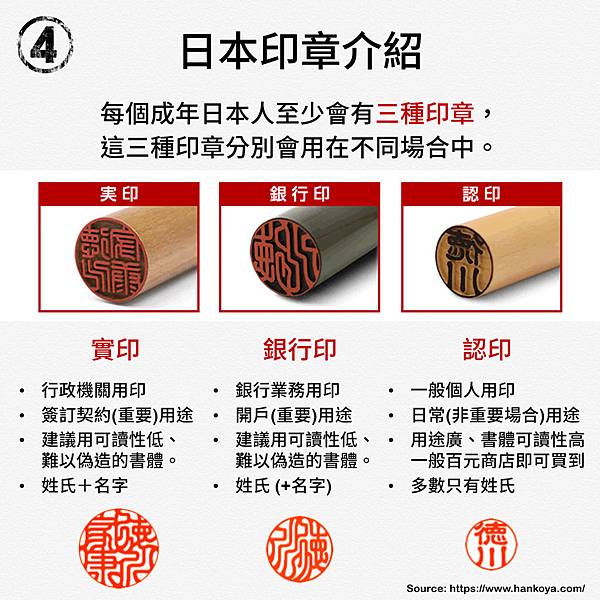 💮実印(じついん),至市(區町村)政廳登記「印鑑證明書」並經過驗證後,方具有法律效力。一般用於簽訂契約、申請立業、房地產與汽車買賣等重要場合中。男性的實印比較大,因此刻入全名是沒問題的;而女性的實印「被建議」要小一些,再加上結婚或離婚後姓氏會改變,因此不少女性會選擇向政府登記「只有名字」的實印。