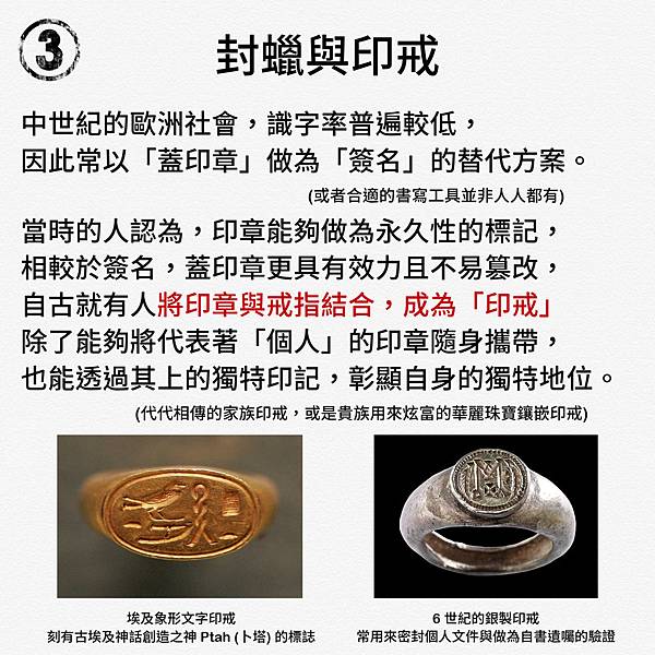 封蠟與印戒早在古埃及時期即有記載使用。有一說法是當時這還未稱作「戒指」,只是埃及統治權貴習慣隨身攜帶的印章,但總是拿著也麻煩,所以就將印章面鑲在小環中,並長時間戴在手指上。人們愈來愈喜歡在印戒上多加裝飾,美觀之外亦能炫富,日久演變成為「戒指」。現今封蠟多為美觀、復古用途,除了用於信封封緘,也有業者使用在酒類瓶蓋的密封包裝上,增顯尊貴質感。