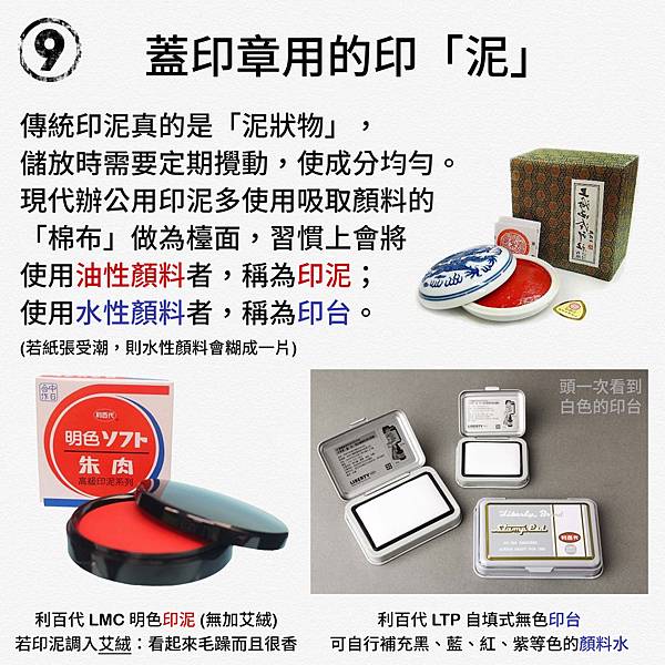 💮認印(みとめいん),在各種日常場合(文件與包裹的確認)都可以使用,不需經過政府機關的驗證。通常會選用容易辨認的字體,認印刻印的價格可便宜可貴,在百元商店、書局甚至能直接買到「你的姓氏」,也因為易取得的原因,認印又被稱作「三文判」(文,江戶時代前使用的貨幣單位,一文錢大約是現今30-35日幣)