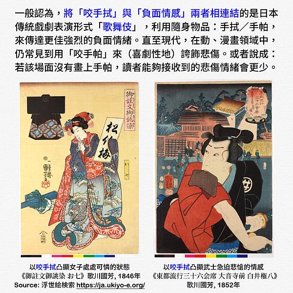 當然在現實生活中,如果你受到挫折,即使你有手帕在身邊你也不會去咬它,「咬手帕」說到底只是在藝術與影視作品中用來誇飾負面情緒的常用手法之一。斗大的汗珠😅變成愛心的眼睛😍不加空格的==臉這些手法(畫法)也都是為了凸顯情緒,方便讀者快速解讀。