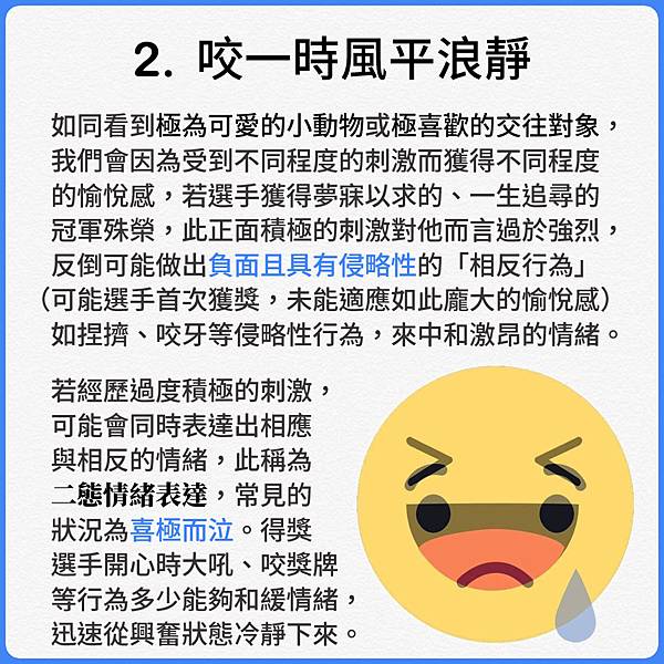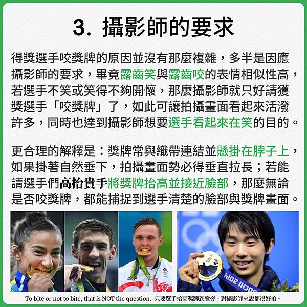 「抬高獎牌、靠近臉部」是我認為最合理的解釋,目的都是為了讓攝影師能同時清楚拍攝到獎牌(最好是大家都能翻到同一面)與得獎選手們的臉部。對於體積較大(難以入口XD)的紀念品如獎盃與獎盤,則會做出「親吻」動作,這也是為了讓重要的獎品能靠近您重要的臉,讓攝影師好拍照😘🏆